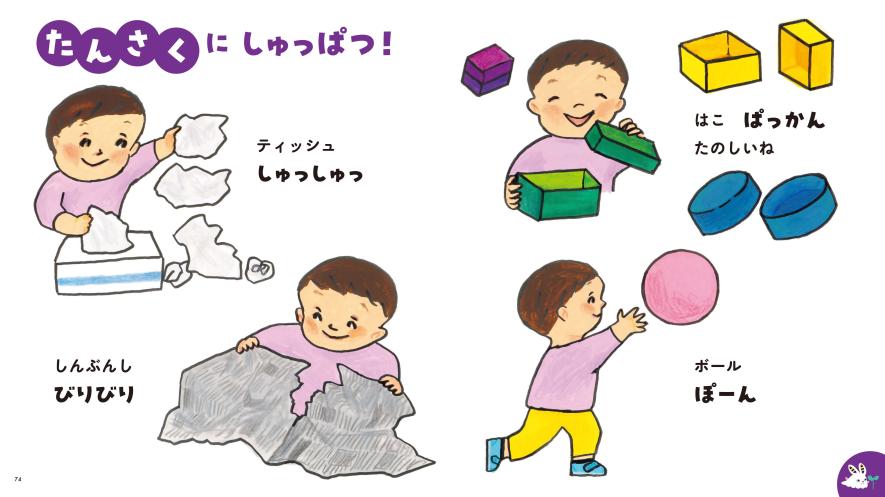 親からすると、1さい「たんさくに しゅっぱつ!」に出てくる、<ティッシュを出す><新聞をビリビリ破る>という行動は、あまり歓迎できないかもしれません。ですが、 子どもはこうした一つ一つの小さな身体的な活動を通して、世界を知っていくのです。