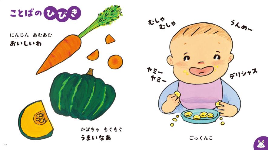 ワンワン、ニャンニャン、ブーブー、クックなどもよく使われますが、これらの言葉の共通点は、真ん中に促音の小さい“つ”があったり、小さい「やゆよ」の入った拗音や、伸ばす音が入ることです。こういった一定の言葉のリズムがあることは、赤ちゃんの言葉の学習を支えています。食事の場面などでも、「もぐもぐ」「むしゃむしゃ」など多様で複雑な表現がありますが、赤ちゃんは最終的には全部うまく使い分けるようになるんですよ。そうした多様な言語表現を入れたいと思って作ったのが、この「ことばのひびき」という項目でした。
