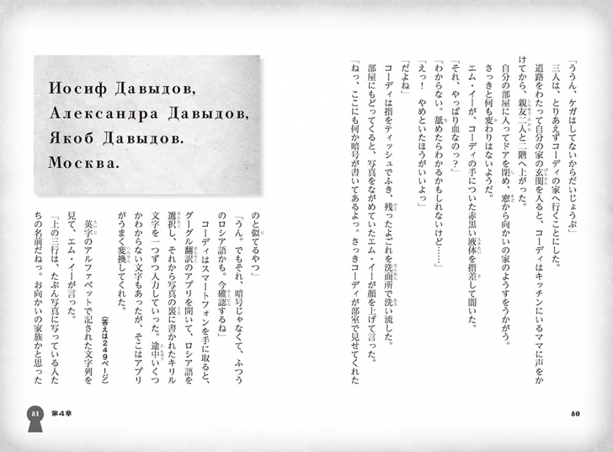 「暗号クラブ」は、本国アメリカ以上に⽇本で人気で、実は⽇本の⼦たちが楽しめるように暗号や物語をかなり編訳させてもらっています。5 巻から「リカ」という⽇本⼈の⼥の⼦が加わり、メンバーが 5 ⼈になるのですが、これは作者が⽇本の読者のために作ったキャラクターなんですよ。英語の暗号はそのまま使えないので、暗号事典やネタ本を買い集め、⽇本語にできそうな暗号を探して組み込むなど、編集者さんと工夫しています。⽬次の指⽂字表記も、⽇本版オリジナルのアイデアです。