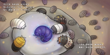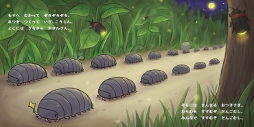 3月14日に出版された、私の絵本『だんごむしまつり』は、ある晩に開催されるだんごむしたちのおまつりと、そこに現れた、一際美しい青い色のだんごむしをめぐるお話です。私は、ミュージカル「キャッツ」が大好きなので、そのだんごむし版といったイメージで物語を作りました。