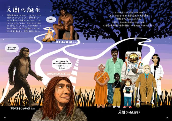 さいごに、この絵本では構成の都合で人が一番最後にでてきますが、人間が一番進化した生き物、というわけではないんです。犬が読む絵本なら最後に犬をたくさん描いたでしょう。そのくらいの理由です。どんな生き物も同じだけの時間の長さをそれぞれの進化を経て生き残ってきたスペシャリストで、その全員が、どちらがえらいとかもなく、まるで支え合うように、きれいな空気や食べ物のあるこの美しい世界を作り続けています。そのみんなが、実は血のつながった兄弟なんだぜ!っていう、そんなロマンも感じてほしいですね。