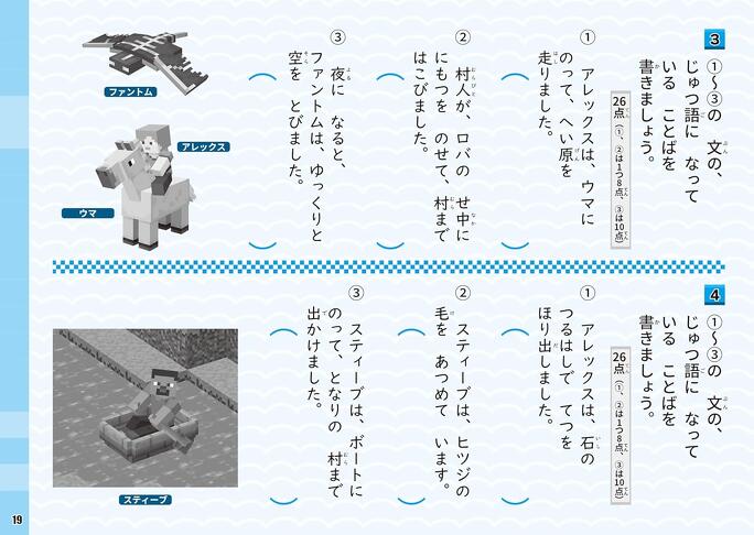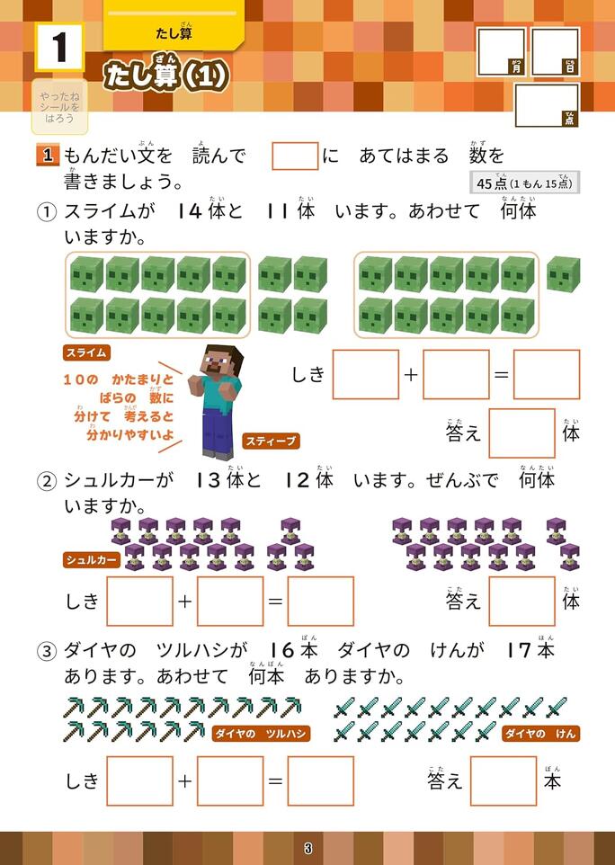 「スライムが14体と11体います。あわせて何体いますか。」など、マイクラ好きの子ども心をくすぐる文章題をたっぷり掲載! マインクラフトの世界観を楽しみながら、文章を読んで式を立てる力を養えます。