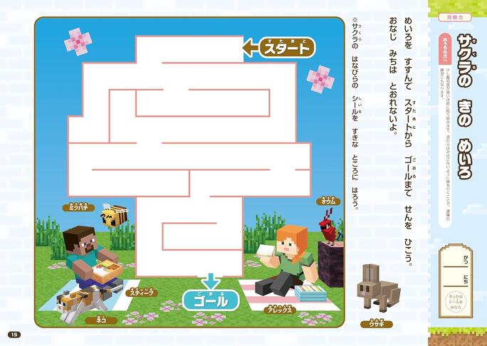 入学前に習得しておきたいことを、パズルを解くように楽しく身につけられる「おけいこドリルシリーズ」『おけいこドリル ちえ』ではすべての学習の基本となる考える力を、『おけいこドリル マインクラフト プログラミング』ではパズルや迷路で遊びながらプログラミング的思考力を、『おけいこドリル マインクラフト かず・とけい』では数の数え方や時計の読み方を、『おけいこドリル マインクラフト ひらがな・カタカナ』では読み書きをゲーム感覚で練習できます。シールを貼りながら解く問題や、ミニクイズ・迷路などの遊び要素も満載です。