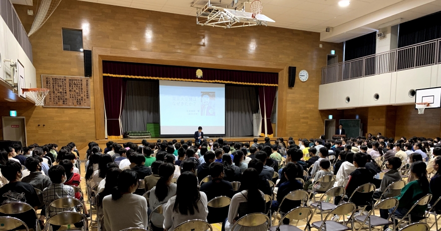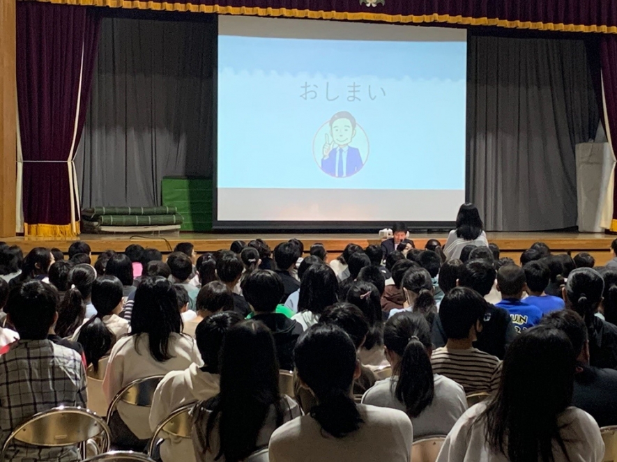 授業を受けたのは5・6年生あわせて300人弱で、体育館いっぱいに集まった子どもたちがみな興味津々な様子で先生のお話に耳を傾けていました。
