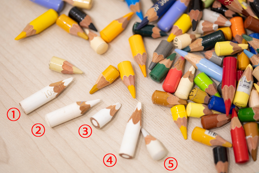 上の写真の下に並んでいる、5本の白いちび色鉛筆。一見、同じ色に見えるかもしれませんが、じつは3種類の色鉛筆が混在しています。①、③、④は、ホルベインの「ソフトホワイト」、②はホルベインの「ホワイト」、⑤のちび白鉛筆は白ではなく「ウォームグレイ」。こうした色鉛筆を、どのように使い分けているのでしょうか?
