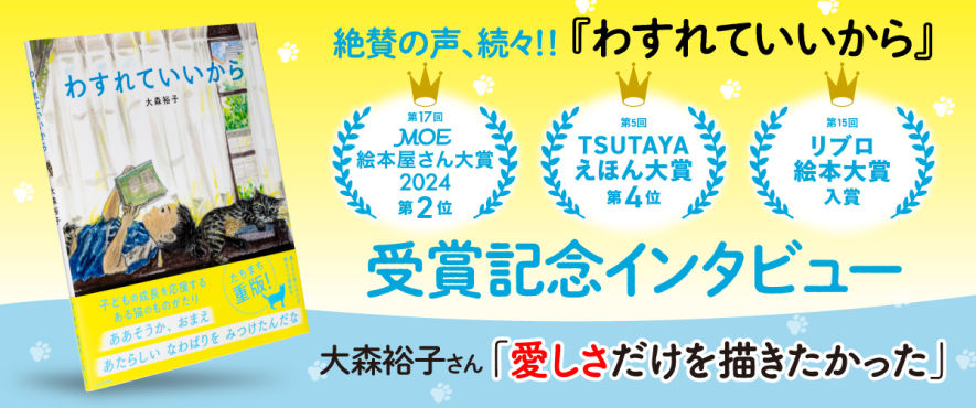 猫の目線から、男の子の成長と巣立ちを描いた『わすれていいから』が、MOE絵本屋さん大賞2位入賞となりました! 今回は入賞を記念して、著者の大森裕子さんに『わすれていいから』制作の裏側を聞きました。