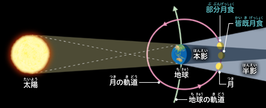 「月食」は、太陽と月のあいだに地球が入り、地球のかげが月をおおってしまう現象です。