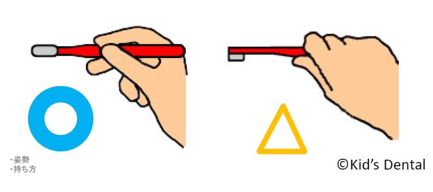 子どもの小さいお口は開けさせづらいし、みがき方がよくわからないまま自己流でみがいている保護者の方もいるかもしれませんね。1~3歳は虫歯の発生頻度もいちばん高い時期です。保護者の方が正しい歯のみがき方をこの時期にマスターしておくのは非常に大事です。小児歯科では、お口の状態をみてもらうとともに、正しい歯のみがき方を教わってください。歯ブラシの持ち方は、鉛筆持ちにしましょう。歯ブラシのブラシの毛質もうまくみがくためには意外に重要なポイントです。安かろう悪かろうでは効果が上がらずもったいないので、歯科医で扱う子どもの仕上げみがき用の歯ブラシを使うとよいでしょう。