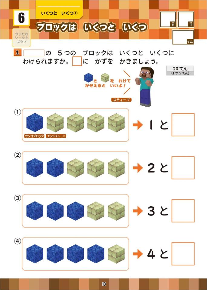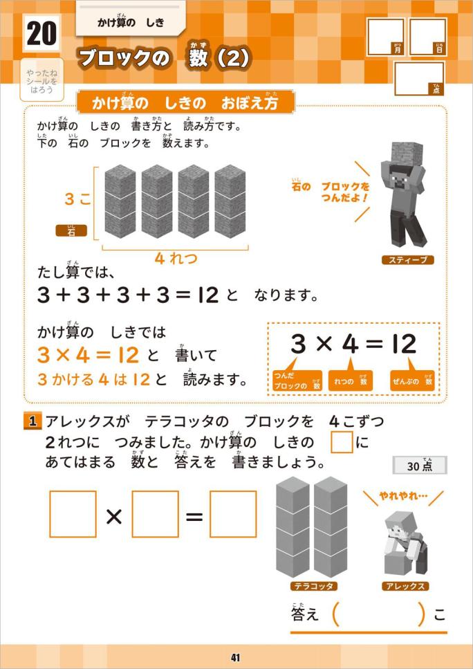 小学1年生で学習するたし算とひき算を学べる一冊です。ゲームに登場するアイテムやMOBの数を数えたり、足したり引いたりしていきます。算数の基礎となる計算をゲーム感覚で学び、計算好きになっちゃいましょう!