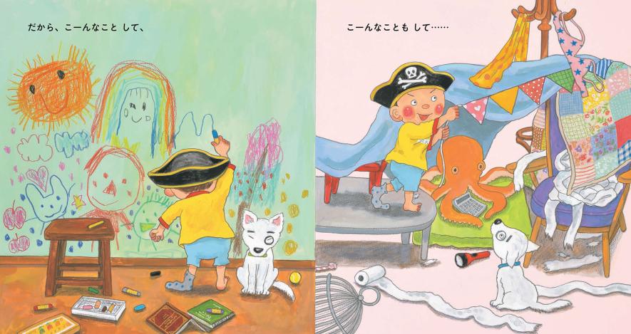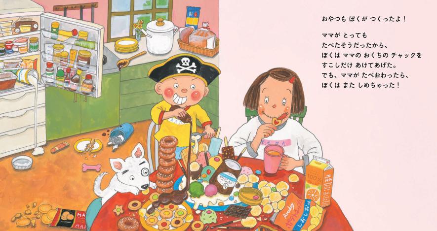 たとえば、応募してくださったお子さんの絵を、壁や床の落書きのところに使わせてもらいました。ほかにはおやつのシーン、ママのソファにたくさんのぬいぐるみを並べるところ、秘密基地の様子、しゃぼん玉などなど……本当にあちこちに使わせていただきました。