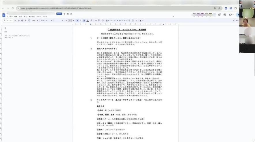 22日の講座に向け、参加者2~3人毎にグループを結成。事前課題である「小説のテーマ、あらすじ、キャラクターの基本設定、人物相関図」を作成しました。