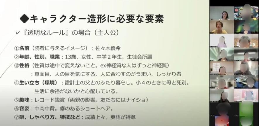 2024年7月22日(月)に、 “創作に興味があるN高等学校・S高等学校“を対象に、『透明なルール』(4/24刊行)をはじめ、次々と児童文学のヒット作を生み出している小説家・佐藤いつ子さんを招いたオンライン講座「現役小説家に学ぶ! 創作の秘訣」を開催しました。