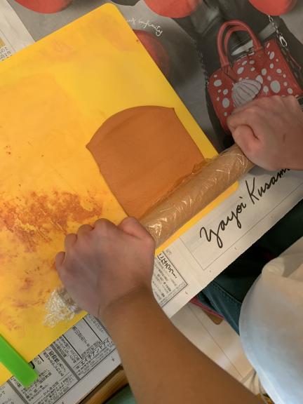 麺棒をラップでつつみ、よごれないようにねんどをのばす。