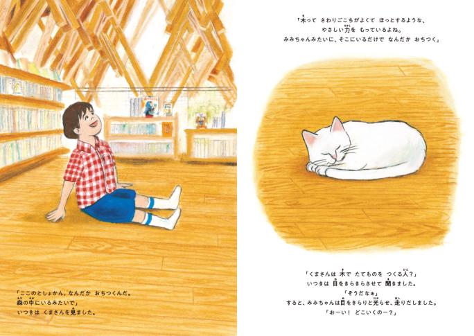 たつみ:子どもたちと隈さんが出会うきっかけがほしくて、猫を登場させました。隈さんご自身も子どもの頃、動物が好きで、その中でも猫が好きだったそうです。取材で「木は猫のようだ」と仰っていたこともあり、猫を意識しました。