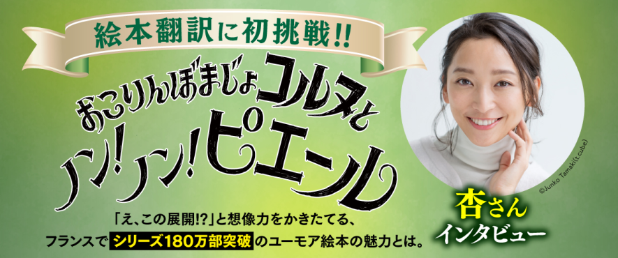 杏さんの絵本への愛情と、作品への思いが感じられるインタビューでした。『おこりんぼまじょコルヌとノン! ノン! ピエール』をお読みいただき、ピエールとまじょコルヌの対決!? をお楽しみください!