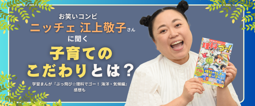 多方面で活躍しつつ、家庭では二児の母親として育児にも励む、お笑いコンビ・ニッチェの江上敬子さん。日々、仕事と子育てに奮闘する江上さんに、“笑いながら読んでいるうちに「理科っておもしろい!」という気持ちが育つ”、小さいお子さんにぴったりの学習まんが『ぶっ飛び☆理科でゴー!』をご紹介。作品の内容にも触れていただきつつ、家庭でのお子さんとのエピソードや、自身の学習まんがに関する思い出などを伺いました。