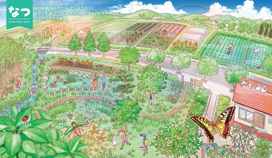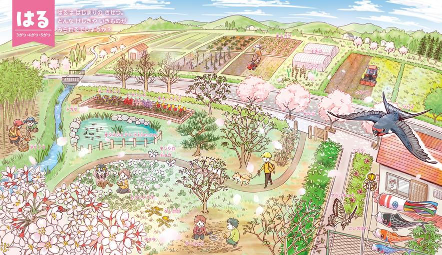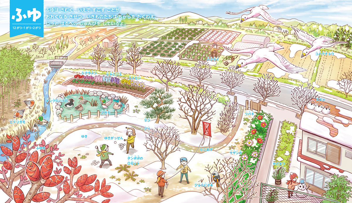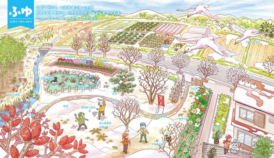 麻生先生:幼児教育においても、四季の移り変わりを知るために定点観測はとてもよいと思っているのですが、この図鑑でも同じ場所で、四季を細かく、まるで絵本のように描かれているのが素晴らしいですね。