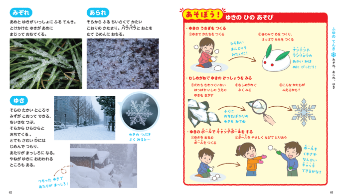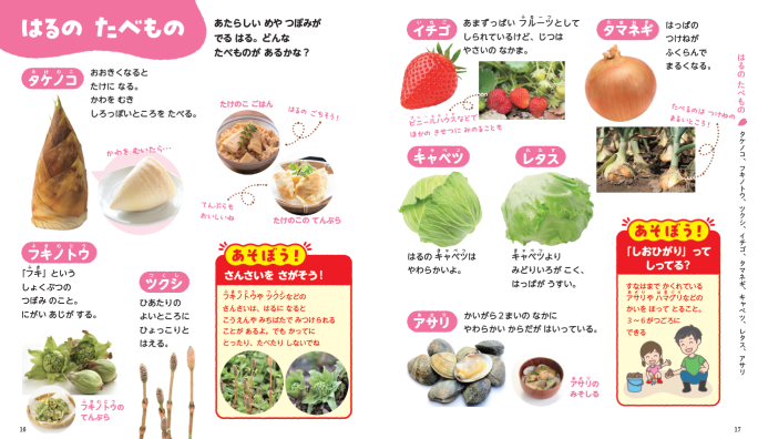 横山先生:図鑑は本棚にしまうと取り出すのがおっくうになってしまうので、机の上に置いていつでも手にとれるようにしてほしいですね。あとは、四季のイラストのページで「絵探し遊び」をしてみましょう。アマガエルはどこ? カタツムリはどこ? と親子で交代して問題を出して、何秒で探せるか、競い合ってみるのもおすすめです。そのうちに、どの絵がどの季節のページにあるかを覚えてくるはず。もちろん、図鑑の写真と実物を照らし合わせに外に出かけるのもいいですね。