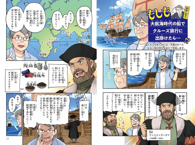角川まんが学習シリーズ『世界の歴史』第7巻の「もしもまんが」。羽田先生が大航海時代の歴史人物たちとクルーズ旅行に出る。