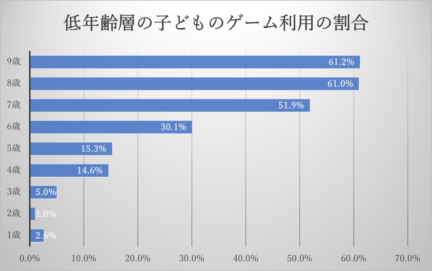 全国的な傾向を見てみると、2歳で6割の子どもがインターネットを利用するようになり、そのうちゲームをする割合は1%ほどと少ない割合です。しかし、6歳で8割が、7歳で9割がインターネットを利用するようになり、ゲームの利用率については6歳で3割、7歳で半数を超えるという結果となっています。このように年齢が上がるにつれてインターネット全体の利用率とゲームの利用率は上昇していきます。 ※(1)