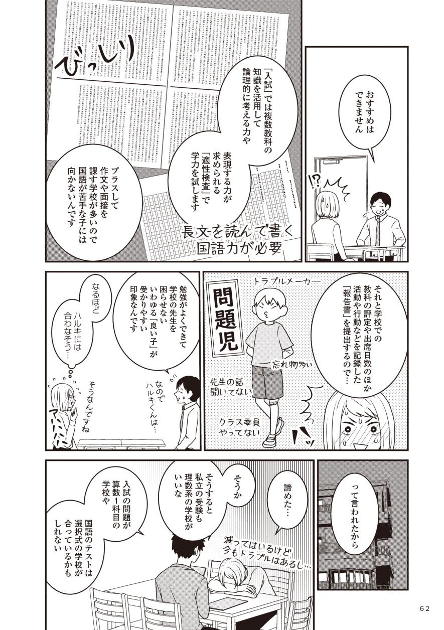 「生きづらいと思ったら親子で発達障害でした」などのコミックエッセイを描いてきたモンズースー氏。子どもが過ごす居場所の選択肢は多いほど良いと考えた彼女が、発達に偏りのある子の進路に悩んでいるご家庭や情報を探している方の力になればと、選択肢の一つとして受験を経験された4つの家庭に取材し、今回実録コミックにまとめました。