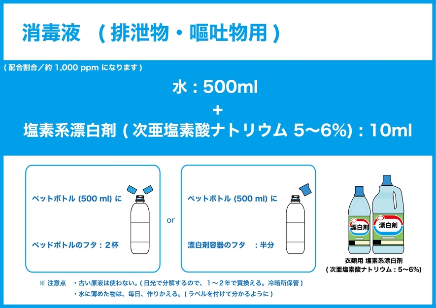 0.1%濃度(1000ppm)の消毒液→水500mLに対して家庭用塩素系漂白剤を10mL入れる