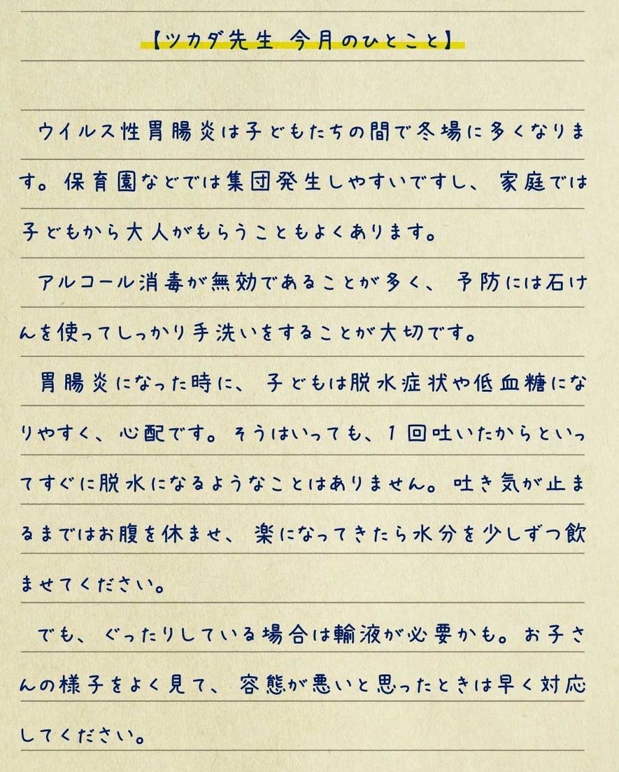 第9回の今月は、「ウイルス性胃腸炎」を取り上げます。 冬場には毎年、乳幼児を中心にウイルス性の胃腸炎が流行します。別名「嘔吐下痢症」ともいわれるように、急に吐いたり、水のような下痢をするのが特徴です。とくに保育園や幼稚園などの集団生活では、感染者が出るとあっというまに広がってしまいます。感染予防と、感染後の対策を中心にご紹介します。