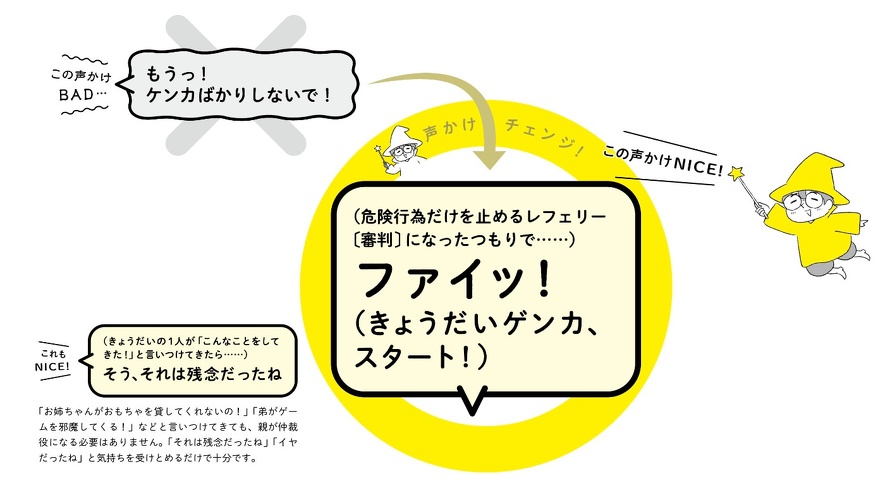 親が止めるべきなのは、手が出るなどの暴力行為。レフェリー(審判)になったつもりで観察し、もしも手が出たら止めます。そしてさぁ、もう1回やるよ~と、「ファイッ!」と、再開の合図。こうすると、子どもたちもバカバカしくなって、ケンカがトーンダウンします。