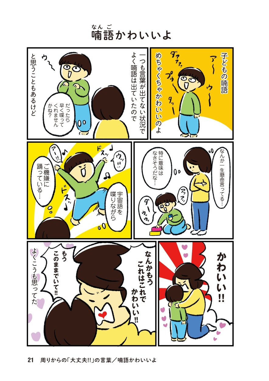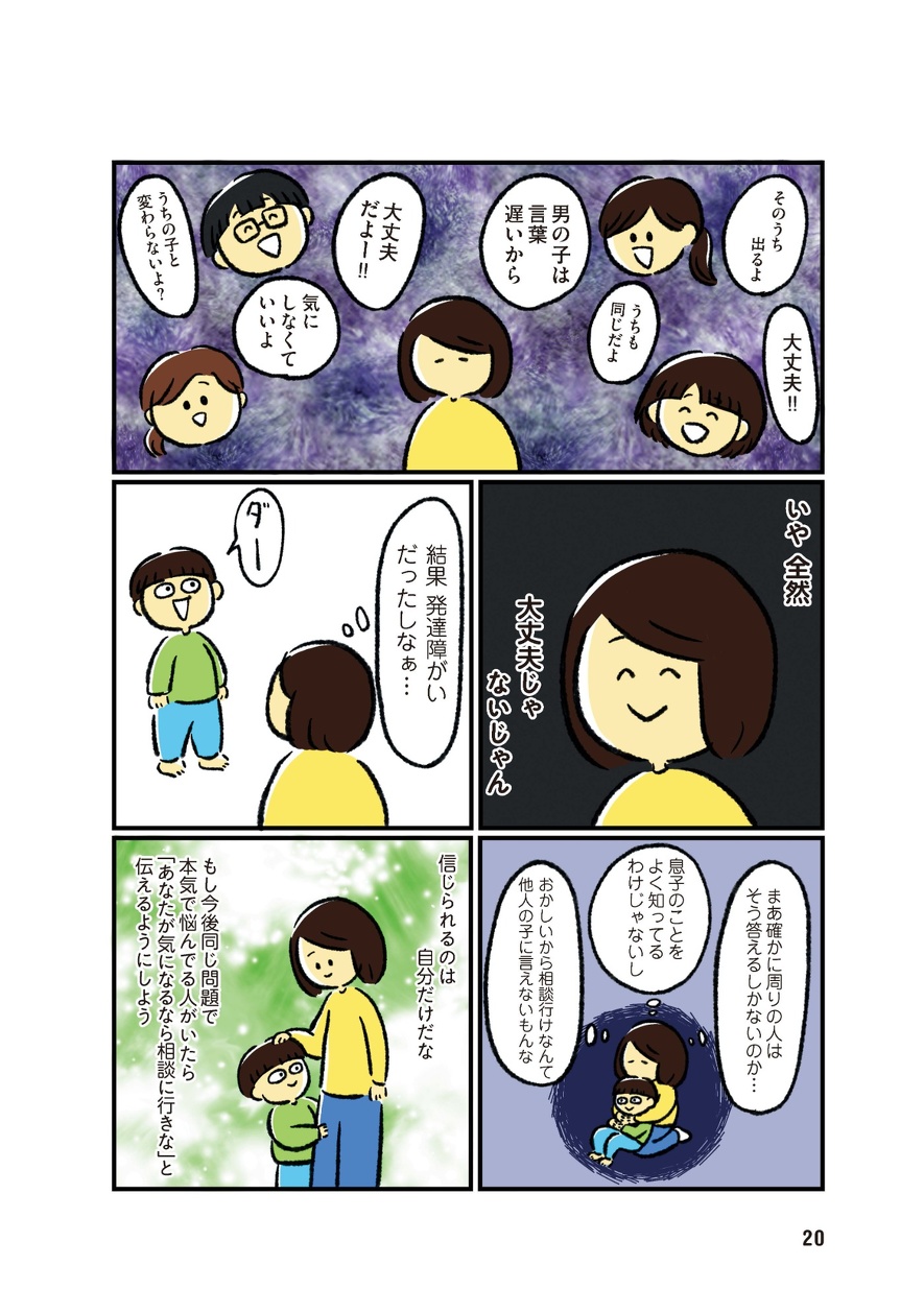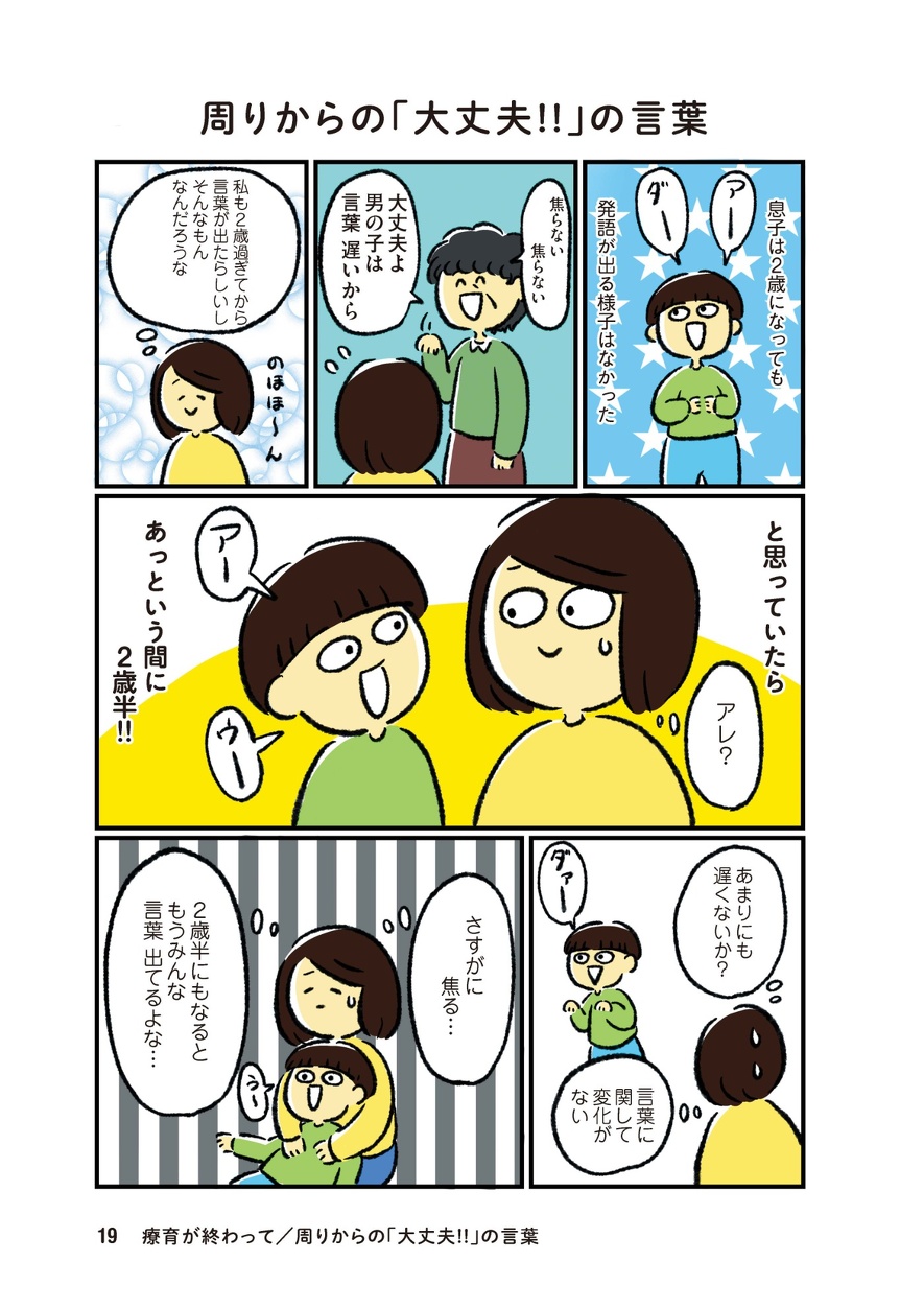 2歳半になっても単語を話す兆しが見られず不安に思うまるさんだが、周囲に話しても「大丈夫」「うちも同じ」「男の子は(元々)遅いから」というアドバイスばかりで、逆にますます思い悩んでいく。