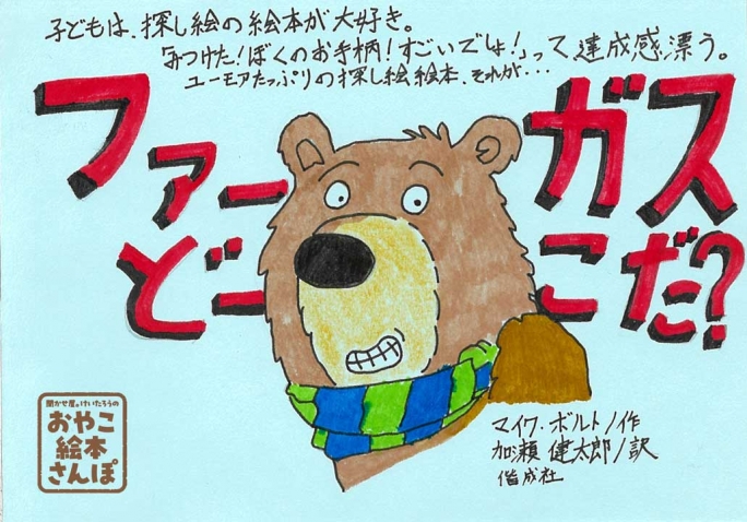 勤務している保育園にはこの絵本を持って行きました。ソファで座って読んでいたら、めちゃくちゃ人気で子どもたちが集まってくる。路上パフォーマーに人だかりができるかんじ(笑)。みんなでファーガスを見つけて指をさしたりするです。子どもたちの興奮がエスカレートすると、ファーガスを見つけた子が手のひらで隠しちゃう。自分がゲットしたみたいなかんじで、手でおおうんです。そうすると、周りの子がすごい怒るの。「取られた」みたいで腹が立つんじゃないかな。自分が指さした後に他の子が指さすというのもいいんだけど、自分が取った、自分が見つけた、「はい締め切りでえす」という感覚なのかもしれない。