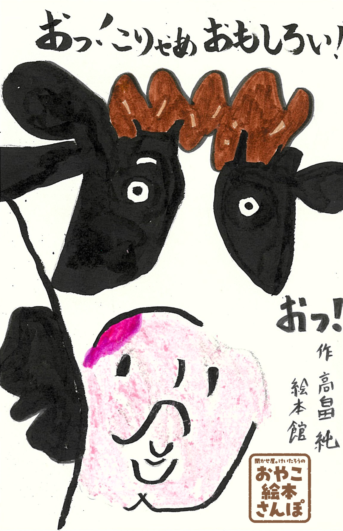 ヨメルバ:そうですね、この本の絵も、白い紙に「おっ!」ていう文字と、振り返った動物だけっていうそのシンプルさが、絵を引き立たせますよね。