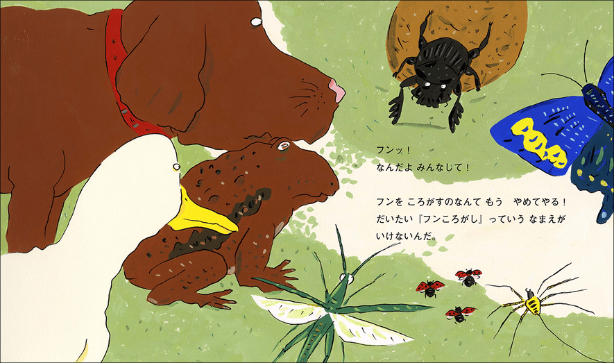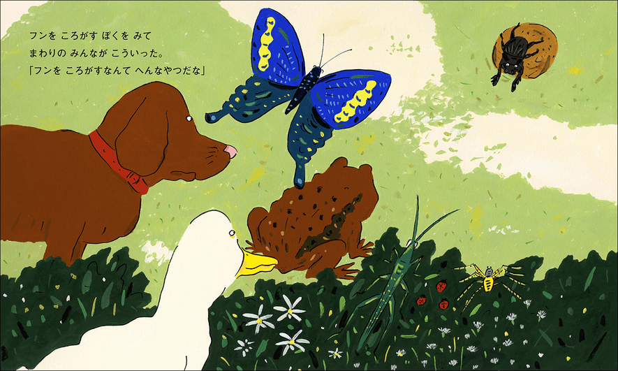 “まわりのみんな”に「フンを ころがすなんて へんなやつだな」と言われた事が物語の発端。同じ虫だけでなく、犬も鳥も来ているのが楽しい所。この絶妙な上から視点、スゴいですよね。
