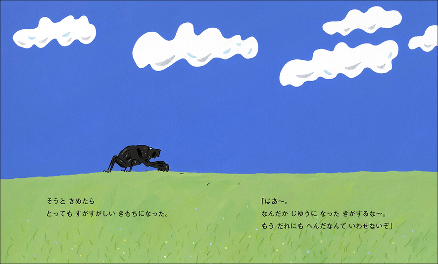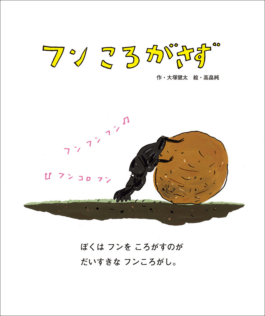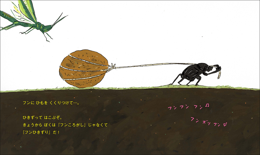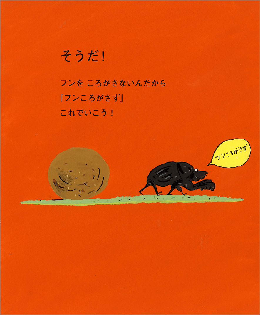 これ、衝撃的ですよね。「フンコロガシ」が絵本の主役になるなんて。タイトルが無かったら、この生物が何者なのか確信が持てません(笑)。そんな彼を主役に据えるとは……なんてアクロバティックなんだ!!