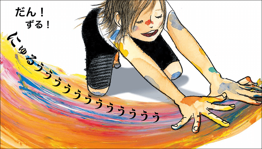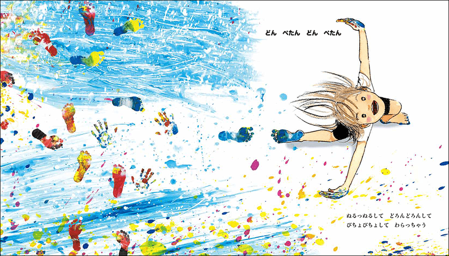 筆に絵の具をたっぷりつけて、とにかく絵を描く女の子。絵本が大きく思える程の、迫力と広がり。