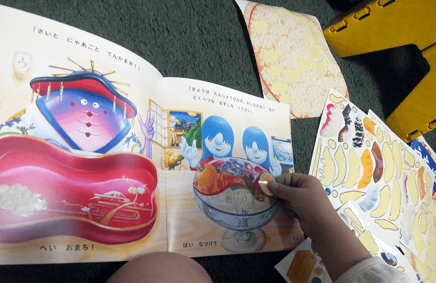 シールは貼ってはがせるようになっているのですが、娘が握った寿司が何ともおもしろかったので、はがすにはがせず……二冊目を買ってしまった絵本です(笑)。
