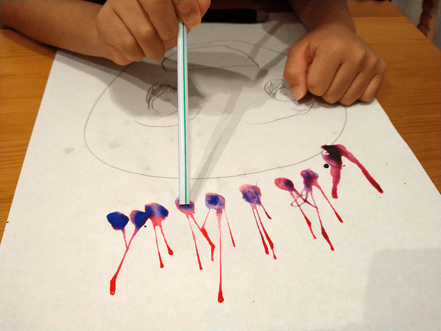 ストローで吹いてもOKです。大人としては「はみ出さないで!」とか「こぼさないで!」とかそういう事ばかり気にしてしまうもの(笑)。でも子どもは、どこまでも広がる事が嬉しいようです。僕らも雑巾を用意して、広い心で一緒にやってみましょう。大人も気持ち良いのですよ、これがまた。