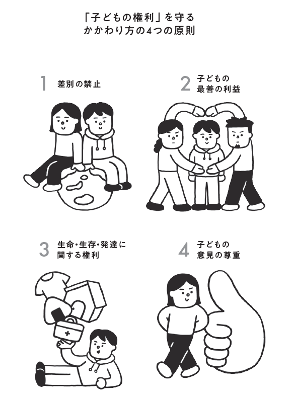 ①【差別の禁止】……性別や年齢、言葉、文化、障害など、どんな理由があっても子どもを差別してはならないという原則です。日常の中でつい口にしてしまいがちな「男の子なのに泣かないの」や、「その色、女の子っぽいね」などの言葉も、無意識の差別につながることを忘れてはいけません。