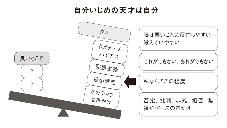 こんな自己否定は自己の存在と価値の対極。いわば心理的安全性を最も脅かす要素と言えます。だけど自分をいじめてしまうのは自分がダメな人間だからでしょうか? いいえ、あなたは全然ダメなんかじゃない。実はダメにフォーカスしてしまうのは「自分」以外にいくつか原因があるのです。