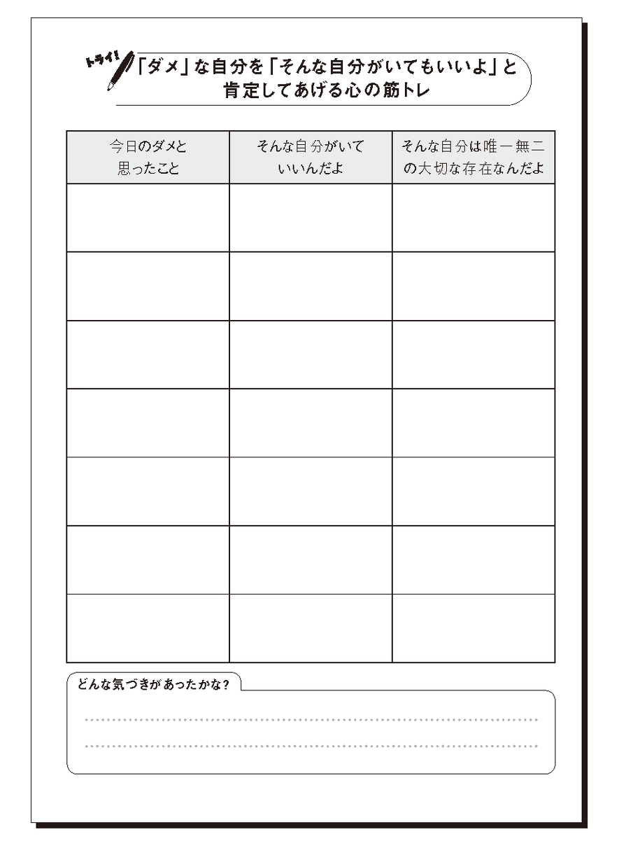 今日のあなたが「ダメ」と思ったことはなんですか? 書き出してみましょう。次に「そんな自分がいていいんだよ」と書いて肯定してあげます。最後はそんな自分の存在を大切に思う自分で締めくくります。これも同様に「そんな自分は唯一無二の大切な存在なんだよ」と書き出します。これはいわば心の筋トレです。やればやるほど筋力がつき、やらなければ衰えます。