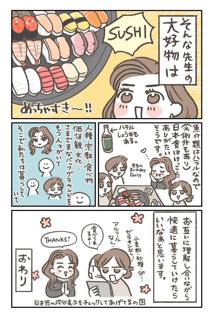 ハニア先生はイスラム教徒(=ムスリム)で、食べ物は「ハラル」の基準に沿ったものを選んでいます。