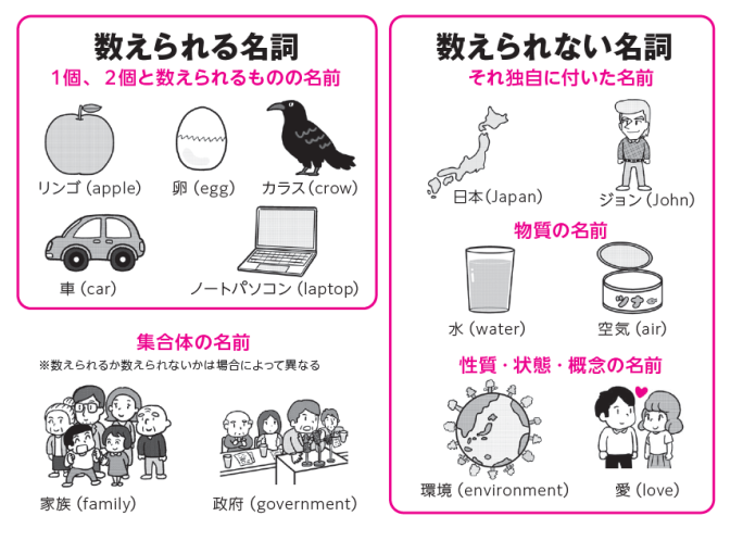 数えられる名詞は、その名の通り、1個、2個って数えられるものの名前やねん。