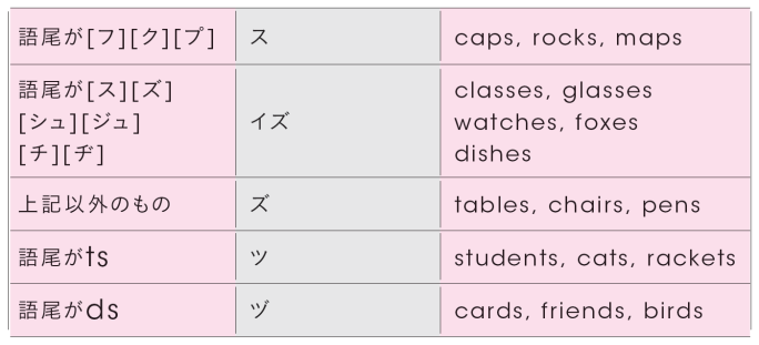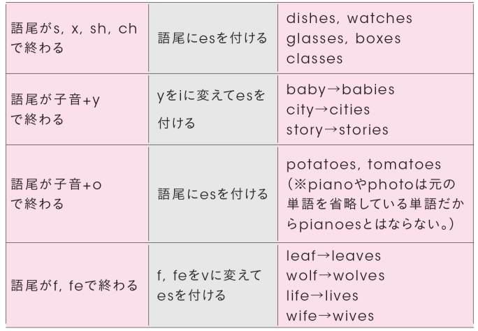 基本的には、語尾にsまたはesを付けんねんけど、語尾の綴りや発音によって変化の仕方が変わるものがあるから覚えときや~。