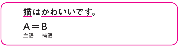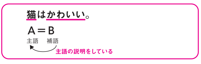 「(A)は(B)です」の文の、Bの部分を補語って言うねん。例えばさっきの例文で言うと、「猫はかわいいです」の「かわいい」の部分が補語になるってことやねんな。補語はどんな役割かと言うと、A(主語)の説明をしてんねん。ここに名詞を入れることができる。