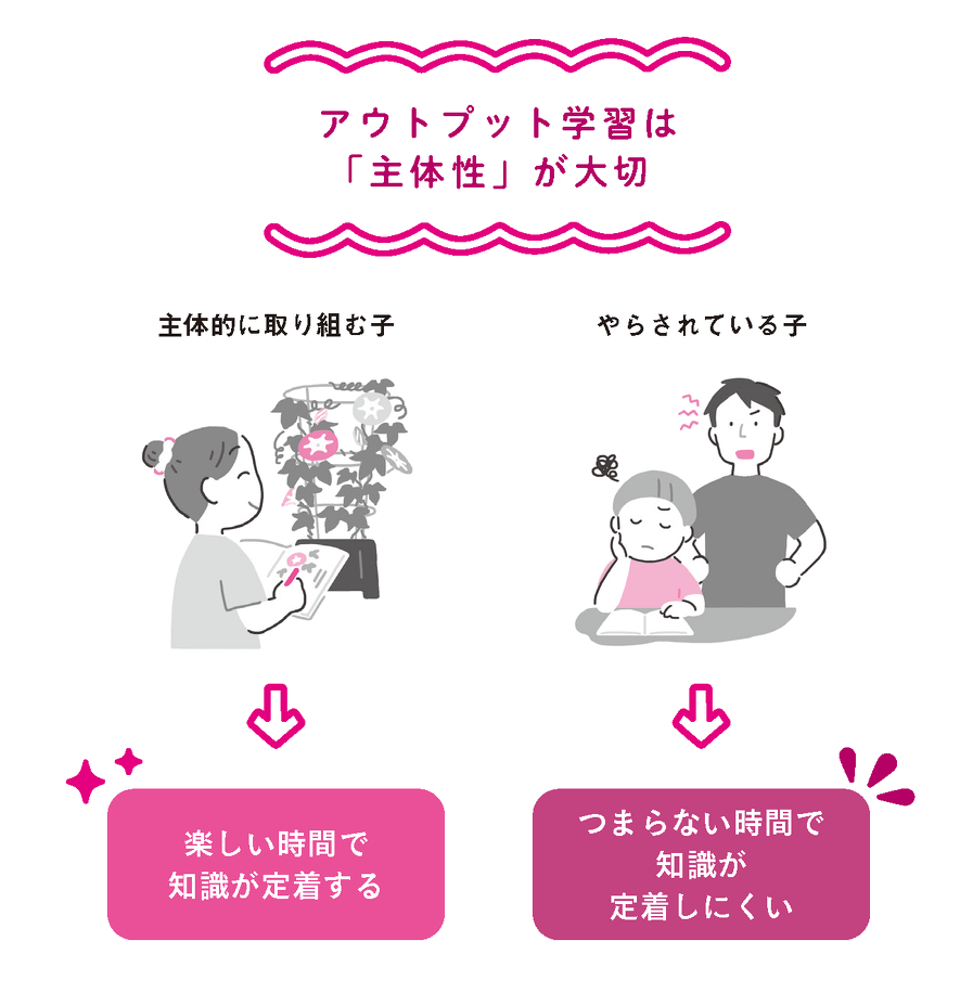 同じように声に出したり、書いたり(描いたり)する学習でも、子どもがやる気を持って主体的に取り組んでいるかどうかが肝心。主体性があれば、知識は定着し、さらなる知識の取得にもつながって学習効果が飛躍的にアップ。しかも、本人は楽しくやっているだけで、学習時間が苦にならない。