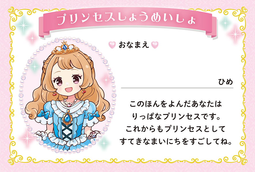 書籍カバーには、切り取って遊べる“プリンセスしょうめいしょ”がついてきます。切り取って、名前を書いたら、自分だけのプリンセスの証に。この絵本を読んだり、実際におやくそくを守れたときは、ぜひこの“プリンセスしょうめいしょ”を手渡してあげてくださいね!
