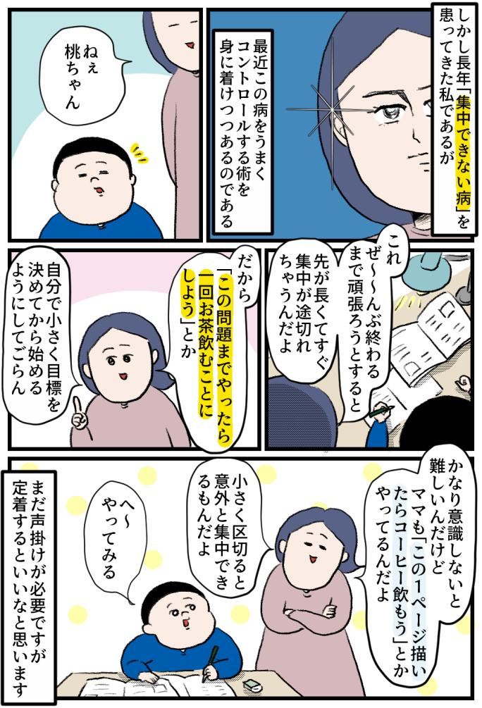 「ここまでは集中する」とちゃんと自分で決めて取り組むことで、少しは集中して取り組めているように思います。