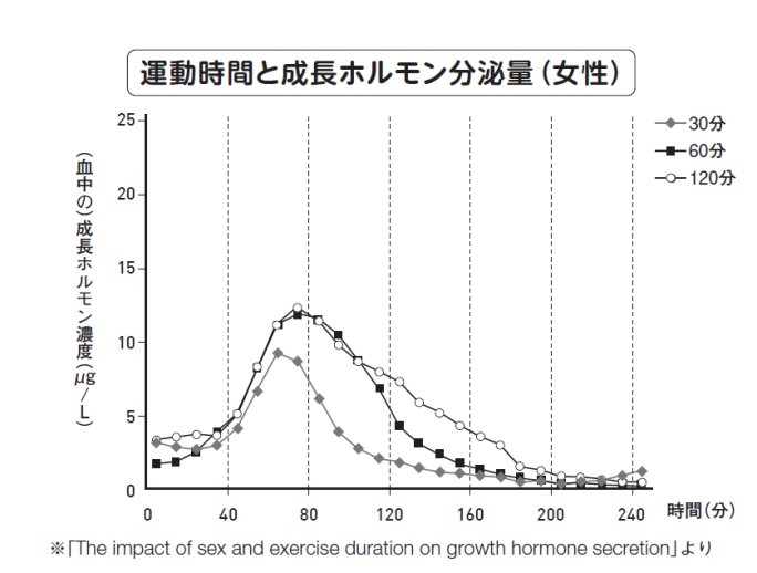 この点からいくと、30分より60分、60分より120分運動したほうが成長ホルモンの分泌量は多くなるということがグラフからわかります。