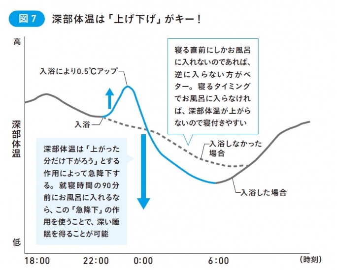 眠りに入っていく時、脳と体(内臓)の温度、いわゆる「深部体温」は下がっていきます(図7)。この深部体温が下がると眠気は強く、深くなるという研究結果が出ています。でも、お風呂に入って温まった直後は脳も体も温度はかなり高くなっていて、ここから体温が下がるまでには時間がかかります。そのため、入浴した直後に布団に入ると深部体温を下げることができず、すぐに眠ることができないのです。塾から帰宅して就寝時間まで時間がないようならお風呂には入らず、パジャマに着替えて睡眠を優先して、翌朝お風呂に入る方が、結果的に良い睡眠をとることができます。