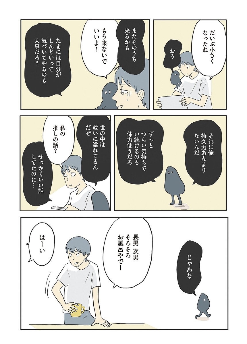 前の回 一覧へ 次の回 いってらっしゃいのその後で 第5話 育児の孤独感 2022年02月24日 保護者 この記事をブックマークする 子どもを慌ただしく送り出した朝。 ひとりになって一番自分らしい瞬間に感じた 日々の小さな出来事を綴ります。毎週木曜日更新予定。 いってらっしゃいのその後で いってらっしゃいのその後で ツルリンゴスター 【定価】 1,210円(本体1,100円+税) 【発売日】 2021年11月26日 【サイズ】 A5判 【ISBN】 9784046808516 試し読み 紙の本を買う 電子書籍を買う おすすめコミックエッセイ この記事をブックマークする 前の回 一覧へ 次の回 この記事をシェアする