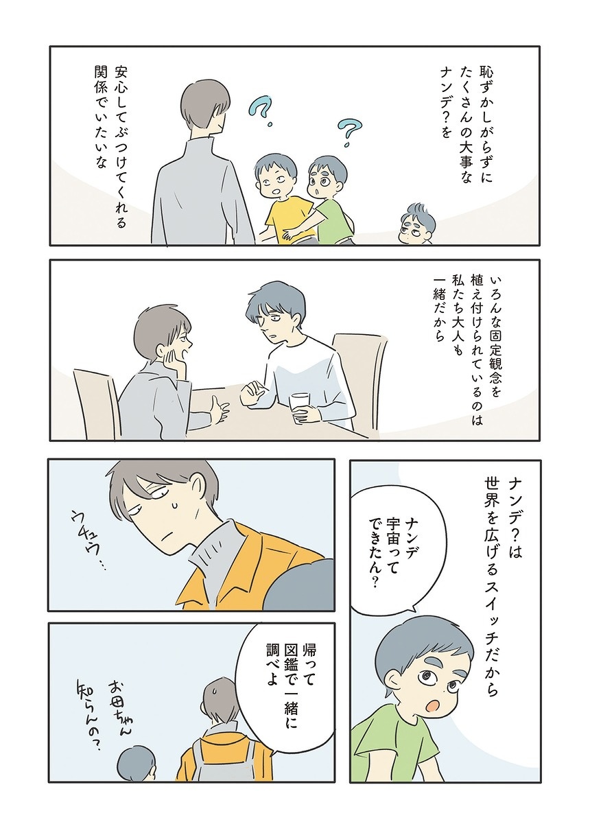 前の回 一覧へ 次の回 いってらっしゃいのその後で 第7話 ナンデ?ナンデ?の長男 2022年03月10日 保護者 この記事をブックマークする 子どもを慌ただしく送り出した朝。 ひとりになって一番自分らしい瞬間に感じた 日々の小さな出来事を綴ります。毎週木曜日更新予定。 いってらっしゃいのその後で いってらっしゃいのその後で ツルリンゴスター 【定価】 1,210円(本体1,100円+税) 【発売日】 2021年11月26日 【サイズ】 A5判 【ISBN】 9784046808516 試し読み 紙の本を買う 電子書籍を買う おすすめコミックエッセイ この記事をブックマークする 前の回 一覧へ 次の回 この記事をシェアする